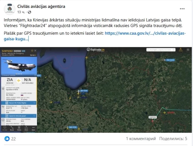 Однако Агентство гражданской авиации Латвии (CAA) сообщило, что такой самолет не залетал в воздушное пространство нашей страны. Информация, отображаемая на сайте Flightradar24, скорее всего, возникла из-за помех GPS-сигнала. CAA в сотрудничестве с международными партнерами отслеживает развитие нарушений GPS-сигнала и напоминает, что эти помехи не влияют на безопасность полетов в воздушном пространстве Латвийской Республики.