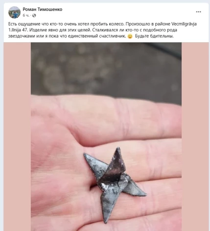 Вот что написал один житель Вецмилгрависа: "Есть ощущение, что кто-то очень хотел пробить колесо. Произошло в районе Vecmīlgrāvja 1.līnija, 47. Изделие явно для этих целей. Сталкивался ли кто-то с подобного рода звездочками или я пока что единственный счастливчик?". К сообщению приложена фотография с изображением самого приспособления - сваренных вместе металлических треугольников, образующих многогранную звезду с острыми лучами.