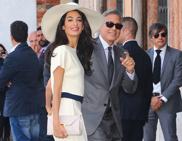 Во время бракосочетания, которое состоялось в присутствии знаменитых друзей жениха — солиста группы U2 Боно, главного редактора американского Vogue Анны Уинтур, супермодели Синди Кроуфорд, актера Мэтта Деймона и многих других, невеста была одета в белое кружевное платье дизайнерского дома Oscar de la Renta, а жених — в смокинг Giorgio Armani. Первый танец Джордж и Амаль танцевали под композицию «Always», под эту же самую песню свой первый танец много лет назад танцевали и родители Клуни Нина и Ник.
