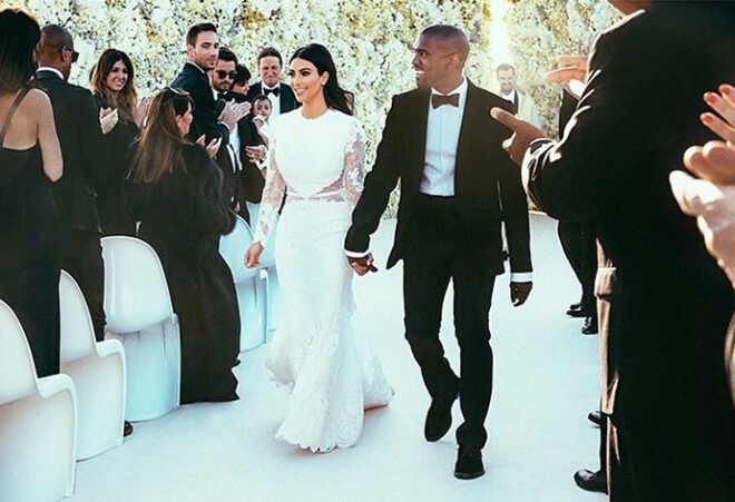 Ким, для которой это был уже третий поход под венец, была одета в белое платье Givenchy Haute Couture стоимостью 500 000 долларов с кружевными рукавами, вставками по бокам и длинным шлейфом, созданное дизайнером этого модного дома и близким другом Рикардо Тиши, и туфли Balmain за 40 000 долларов. На дочери пары Норт, которой 15 июня исполнился год, также было белое платье Givenchy. К алтарю Ким отвел ее отчим Брюс Дженнер под балладу «Con te Partiro» в исполнении знаменитого итальянского тенора Андреа Бочелли. Жених был одет в черный смокинг Givenchy. Пара обменялась обручальными кольцами от знаменитого ювелира Lorraine Schwartz. В роли подружек невесты выступили четыре сестры Ким — Кортни (35), Клое (29), Кендал (18) и Кайли (17). Брат Роб (27) за день до свадьбы поссорился с Ким в Париже и улетел домой в Америку. Гостей свадьбы угощали блюдами тосканской кухни (домашней пастой с рикоттой, стейками из филе говядины, картофельным пюре с трюфелями). На сладкое, помимо семиэтажного торта за 7000 долларов, подавали клубничное сорбе. Гости также наслаждались эксклюзивным розовым шампанским Armand de Brignac. Медовый месяц миссис и мистер Уэст провели в средневековом замке в Ирландии.