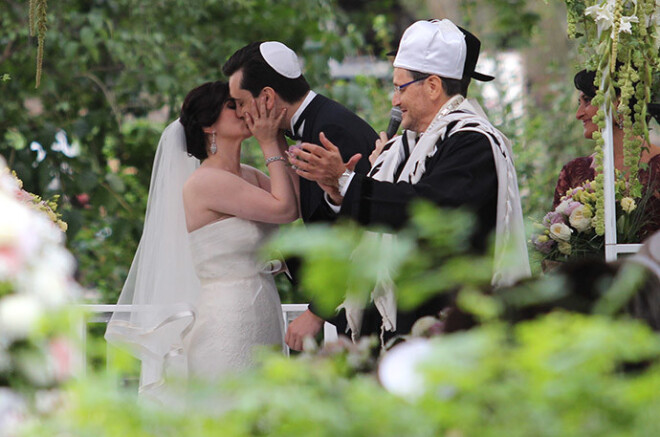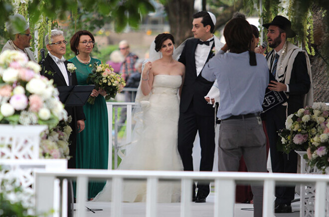 С самого утра в парке, лишь часть которого была перекрыта для движения, велись приготовления к торжеству — расставлялись столы и возводилась беседка с местами для сотни гостей, среди которых были латвийские предприниматели и звезды российской эстрады. Свадебный обряд проводился согласно еврейским традициям — невеста семь раз обошла жениха, стоящего под хупой, раввин читал ктубу — брачный письменный договор будущего мужа перед невестой, а кульминацией стало надевание кольца на указательный палец невесты со словами «Ты посвящаешься мне этим кольцом по закону Моше и Народа Израиля».