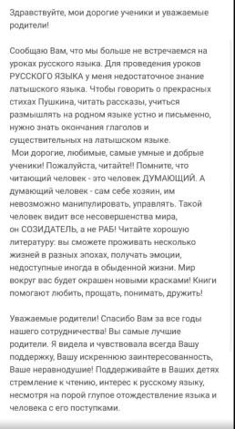"Здравствуйте, мои дорогие ученики и уважаемые родители! Сообщаю вам, что мы больше не встречаемся на уроках русского языка. Для проведения уроков РУССКОГО ЯЗЫКА у меня недостаточное знание латышского языка. Чтобы говорить о прекрасных стихах Пушкина, читать рассказы, учиться размышлять на родном языке устно и письменно, нужно знать окончания глаголов и существительных на латышском языке..."