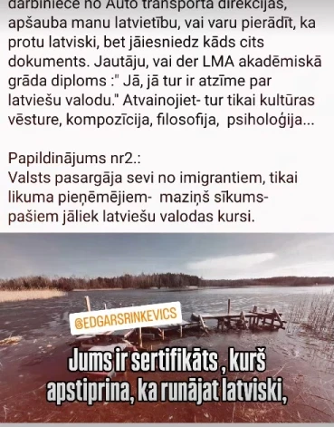 В своем посте женщина отметила, что государство защищает себя от иммигрантов, но в таком случае законодатели сами должны проходить курсы латышского языка. Художница также отмечает, что люди предпочитают оставаться в стороне и не вмешиваться в проблемы других, пока это не касается их собственной жизни. В своем Instagram она также обратилась к президенту Эдгару Ринкевичу с вопросом - есть ли у него документ, удостоверяющий, что он говорит по-латышски?