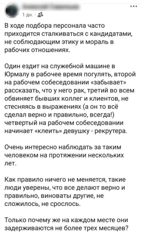 Вот что написал руководитель одной латвийской компании по подбору персонала: "В ходе подбора персонала часто приходится сталкиваться с кандидатами, не соблюдающим этику и мораль в рабочих отношениях. Один ездит на служебной машине в Юрмалу в рабочее время погулять, второй на рабочем собеседовании "забывает" рассказать, что у него рак, третий во всем обвиняет бывших коллег и клиентов, не стесняясь в выражениях (а он-то все сделал верно и правильно, всегда!) четвертый на рабочем собеседовании начинает "клеить" девушку - рекрутера".