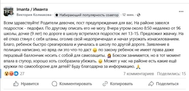 Виктория поделилась шокирующим опытом своей дочери сперва в соцсетях, а затем в программе Латвийского телевидения "4.studija". «В нашем районе появился подросток-педофил — по-другому я его назвать не могу», — пишет она. По ее словам, инцидент произошел около 8:50 утра возле средней школы № 96, когда девочка шла в школу одна.
