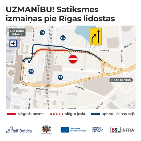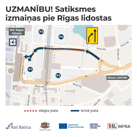 В связи с продолжающимся строительством станции и железнодорожного пути Rail Baltica у аэропорта Риги, с 9 июня в нескольких местах постепенно будет изменена организация движения. Изменения, связанные с монтажом стальных пролетных конструкций железнодорожного виадука, затронут как дорогу к аэропорту, так и доступ к автостоянкам P3 и P4.