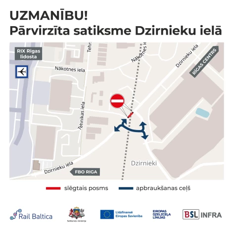 Кроме того, с середины июля до осени незначительные изменения затронут улицу Дзирниеку в направлении центра деловой авиации FBO Riga. На перекрестке у бетонного завода Schwenk движение будет перенаправлено по новому объездному пути.