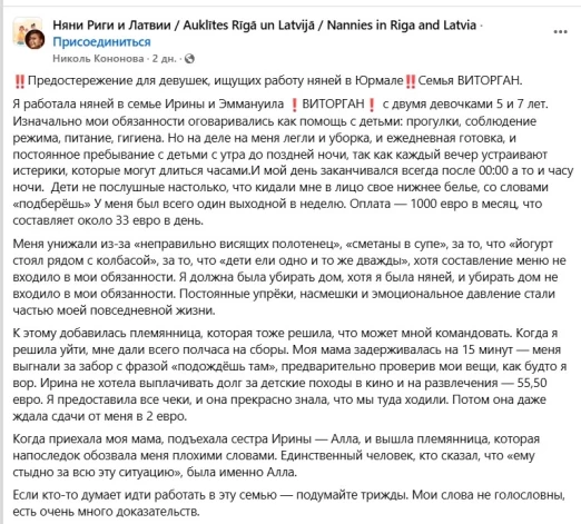 В своем сообщении она пишет: «Я работала няней в семье Ирины и Эммануила Виторган с двумя девочками 5 и 7 лет. Изначально мои обязанности оговаривались как помощь с детьми: прогулки, соблюдение режима, питание, гигиена. Но на деле на меня легли и уборка, и ежедневная готовка, и постоянное пребывание с детьми с утра до поздней ночи…» По словам женщины, у нее был всего один выходной в неделю, запплата — 1000 евро в месяц, что составляет около 33 евро в день. Также, по ее словам, рабочий день часто завершался только после полуночи, а дети могли вести себя вызывающе. Также она описала эмоциональную напряженность: «Меня унижали из-за “неправильно висящих полотенец”, “сметаны в супе”, за то, что “йогурт стоял рядом с колбасой”».