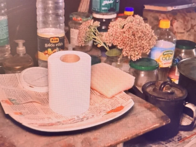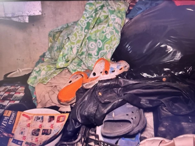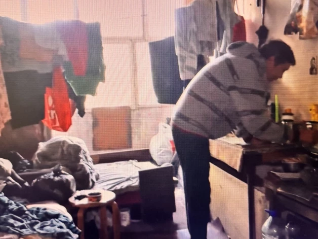 После короткого разговора Константин показал журналистам свою «квартиру». Чтобы попасть внутрь, нужно приподнять одеяло, которое служит дверью. Внутри — несколько старых предметов мебели, посуда, кастрюля с едой, банки, бутылки с маслом и конфетами, одежда.