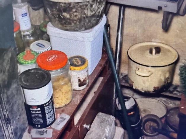 Воду он хранит в пятилитровых бутылках — берёт её из ближайшего колодца. Соседние комнаты служат складом и примитивным туалетом.