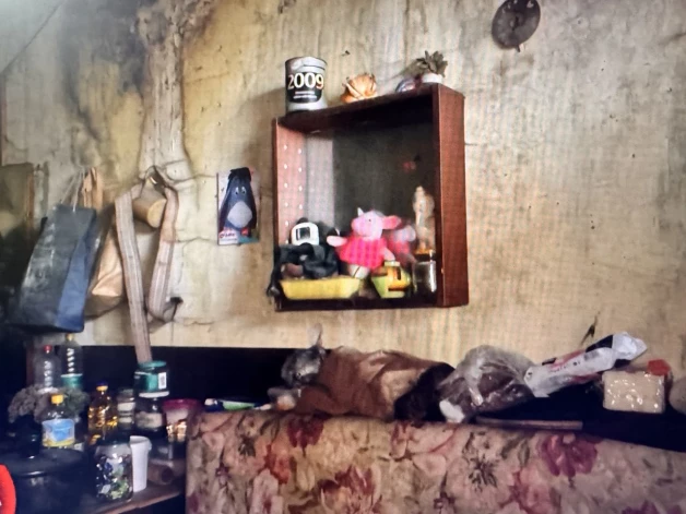 В комнате две кровати — Константин живёт здесь с гражданской супругой, которая в тот момент была не дома. На вопрос, почему он выбрал именно эту комнату, мужчина объяснил: в других местах слишком опасно, дом постоянно осыпается, и лишь вопрос времени, когда обрушится и его часть. «Ну конечно, опасно. Но там ещё хуже — две боковых панели уже рухнули. Здесь ждём, когда и эти упадут. ("А как зимой?") Есть печь, есть дрова», — говорит Константин.