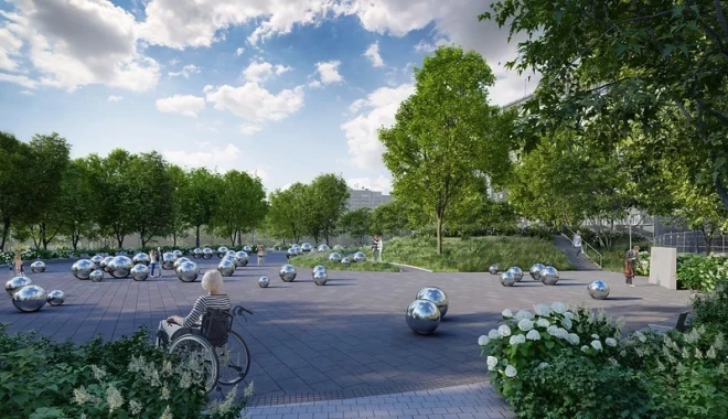 В настоящее время на объекте проводятся работы по устройству покрытий, строительству насыпи холма, озеленению, монтажу элементов благоустройства и установке системы видеонаблюдения.