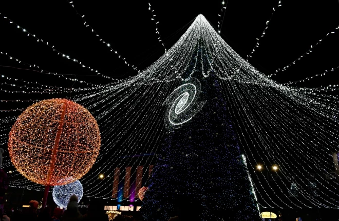Как обычно, центральным элементом стала праздничная елка на площади Виенибас, которая в этот раз превратилась в ось Вселенной. На ее ветвях заискрились бесконечные галактики, символизируя наши мечты — огромные, иногда труднопостижимые, но всегда достижимые. А покрывало световых гирлянд над елкой напоминает о невидимом небесном пространстве, где рождаются идеи, обретают крылья и хранят свет праздника.