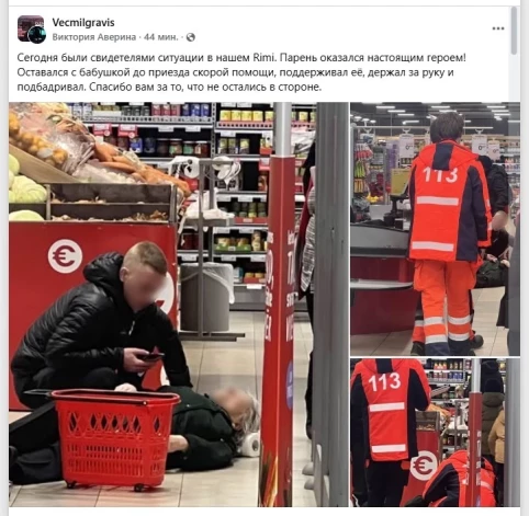 Людей тронул молодой человек, который в супермаркете Вецмилгрависа поддерживал пожилую женщину до приезда скорой