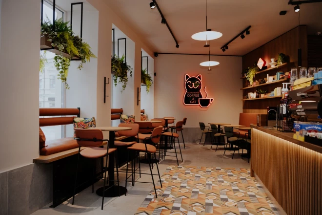 Как и в других кофейнях сети, в дизайне использован элемент, связанный с местной средой: здесь это неофициальный символ города — кот, который украшает улицу Ригас в виде любимой горожанами и прохожими скульптуры, а также присутствует на стене новой кофейни Caffeine.