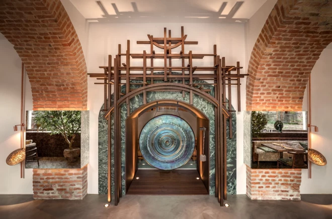 Интерьер поддерживает эту идею культурного диалога. В оформлении пространства можно заметить элементы, отсылающие к азиатской эстетике. К примеру, в банкетном зале установлены панели, характерные для традиционных японских домов. Отдельного внимания заслуживает роспись на стенах - это ручная работа.