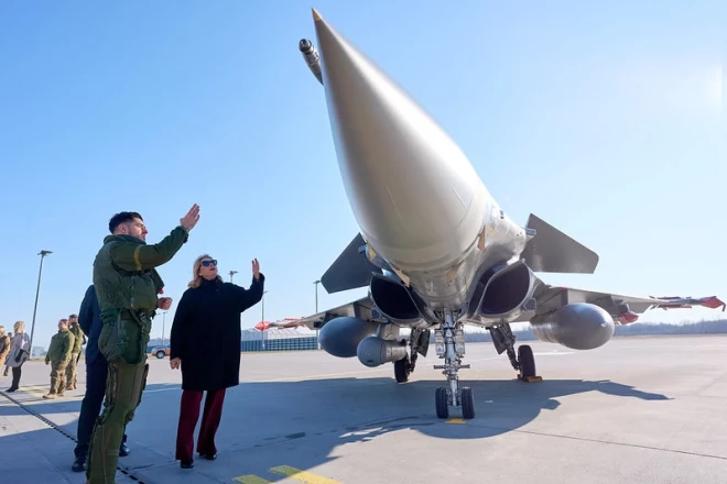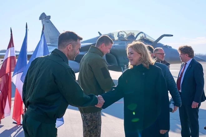 Во вторник, 14 апреля, премьер-министр Эвика Силиня на авиабазе в Лиелварде приветствовала пилотов Военно-воздушных и космических сил Франции, прибывших в Латвию на истребителях Rafale.