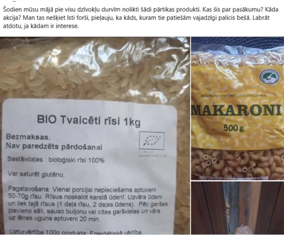 В Лиепае жители одного из многоквартирных домов столкнулись с необычной ситуацией: у дверей всех квартир появились пакеты с продуктами. Женщина рассказала об этом в соцсетях и вызвала бурное обсуждение.