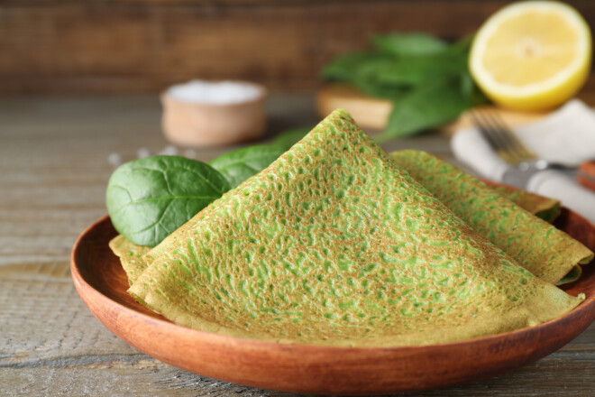 Шпинат поместить в чашу блендера. Добавить воду и сахар, хорошо взбить до однородной массы. Молоко налить в миску, добавить яйца, соль и ванилин, немного взбить венчиком. В молочную смесь добавить шпинат и хорошо перемешать. Следом ввести муку с содой и тщательно размешать тесто, чтобы не было комочков. В последнюю очередь добавить растительное масло и еще раз перемешать. Сковороду раскалить (под первый блин смазать маслом) и выпекать блинчики с двух сторон до легкого подрумянивания.