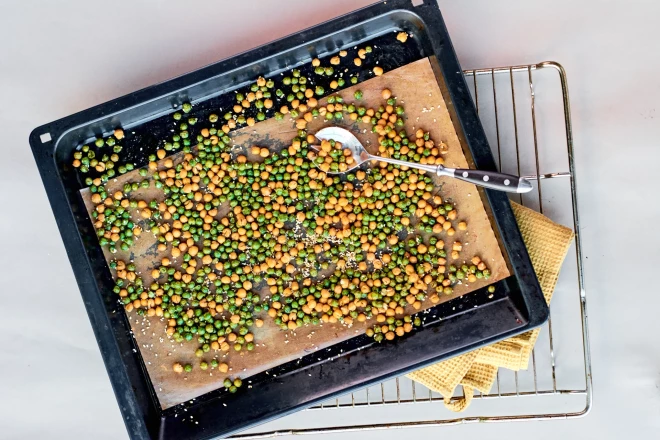 - Высыпь горох на застеленный бумагой для выпечки противень и запекай при температуре 170 градусов около 40 минут, каждые 10 минут открывая дверцу духовки и перемешивая горошек.