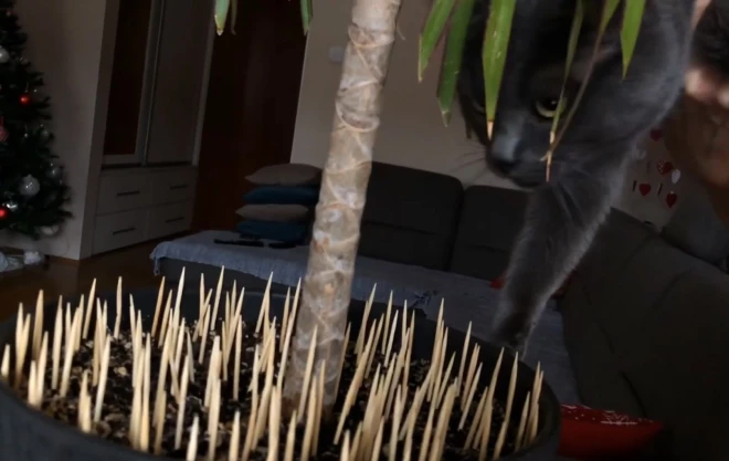 Иногда в горшок достаточно просто густо вставить зубочистки, чтобы получился колючий забор. Он точно не понравится кошке.