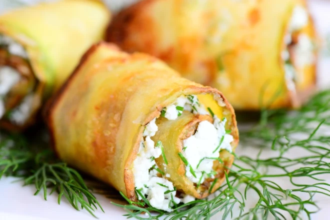 Вкуснейшие рулетики из кабачков с сыром, чесноком и зеленью очень просты в приготовлении, а получается вкусно и красиво — так что блюдо подойдет и для праздничного стола.