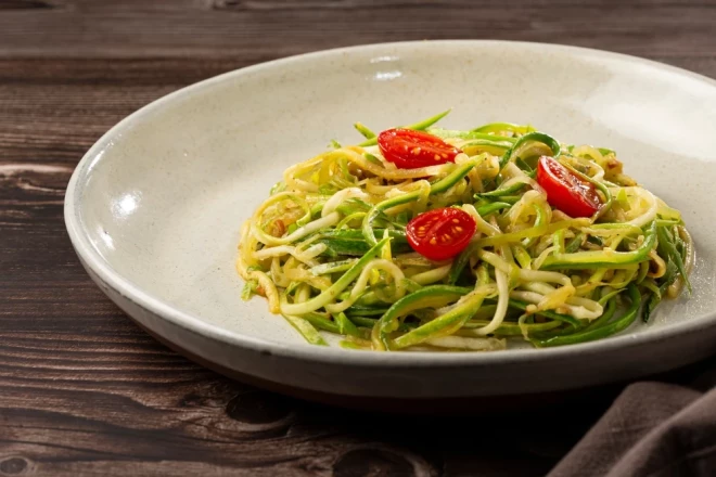 Затем выкладываем на сковороду кабачки, солим, приправляем перцем и готовим не больше 3 минут. Перемешивать ингредиенты нельзя — так как кабачок порезан очень тонко, он при перемешивании просто развалится и превратится в кашу. Чтобы этого не случилось и блюдо не пригорело, нужно периодически встряхивать сковородку.