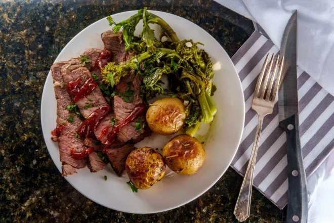 Стейк из говядины на гриле с брокколи и соусом из трав
