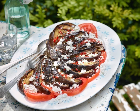 Нарежьте помидоры. Разложите ломтики помидоров на тарелке, обильно посыпав их солью и перцем, полейте оставшимся маслом и лимонным соком. Затем поверх помидоров веерообразно выкладываем жареные баклажаны и посыпаем все натертым овечьим сыром.