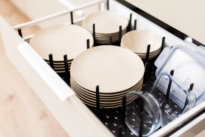 Вставки в полки делают чудеса, создавая второй этаж для хранения в шкафчиках. А держатели для тарелок удержат тарели на месте и уберегут от сколов, если разные тарелки хранятся рядом.