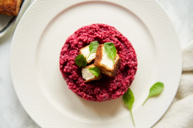 Ячменно-свекольное ризотто с запеченым сыром фета