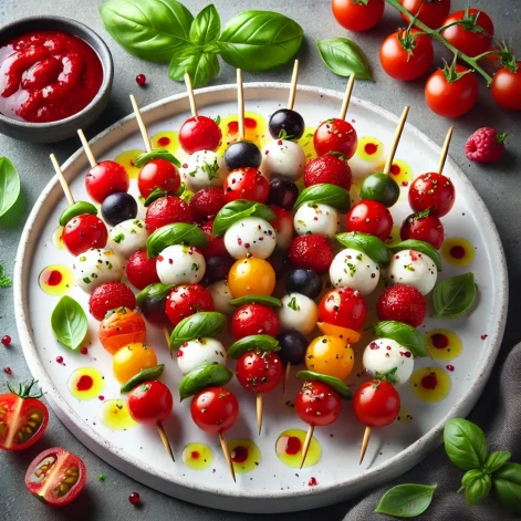 На шпажки чередуйте помидоры, моцареллу и базилик. Полейте оливковым маслом и малиновым соусом перед подачей.