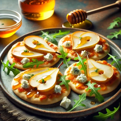 Нарежьте лаваш на небольшие кружки или используйте готовое тесто для пиццы. Положите на них тонкие ломтики груши и кусочки сыра горгонзола. Запекайте в духовке при 180°C 8-10 минут. После запеканья полейте медом и украсьте свежей рукколой.