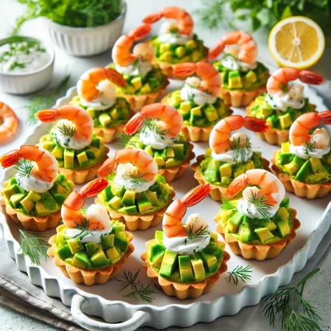 Нарежьте авокадо небольшими кубиками и смешайте с лимонным соком. Отварите или разморозьте готовые креветки. Наполните тарталетки смесью авокадо, сверху положите ложку мойонеза, воткните в него креветку и украсьте укропом.