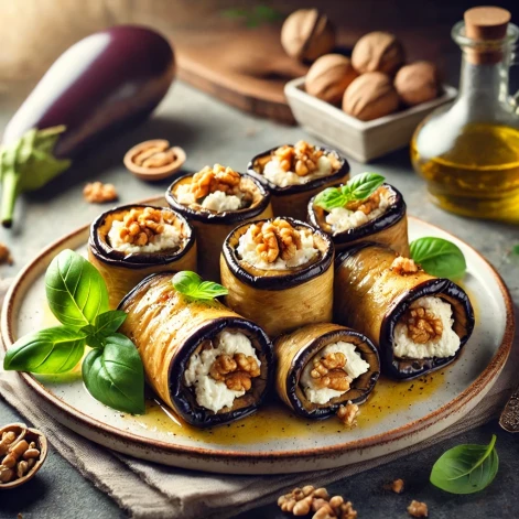 Нарежьте баклажан тонкими ломтиками и обжарьте на оливковом масле до золотистого цвета. Смешайте фету с измельченными орехами и чесноком. Намажьте начинку на ломтики баклажанов и сверните их в рулетики. Украсьте листьями базилика.