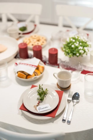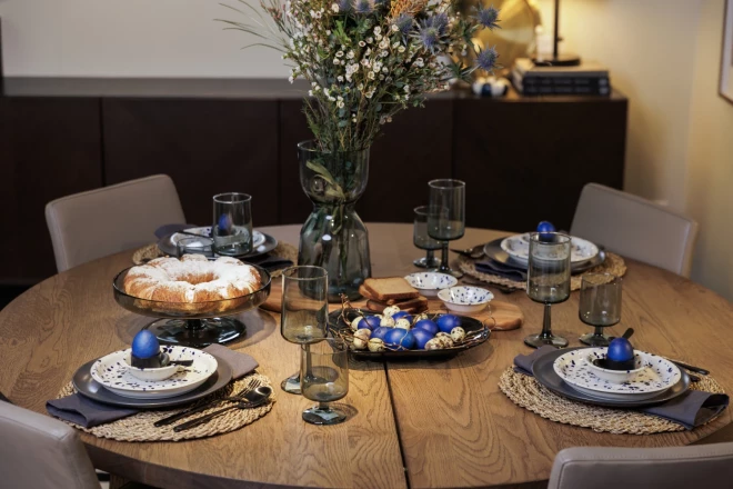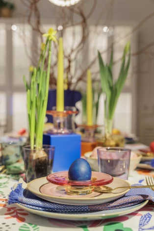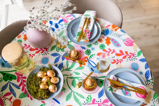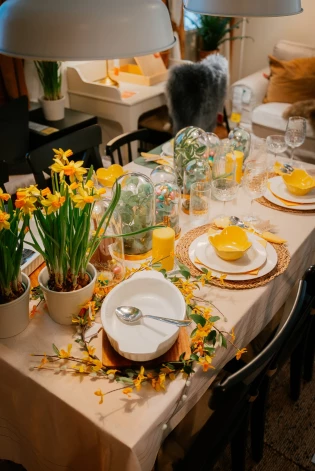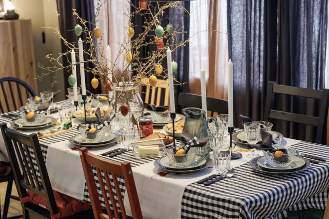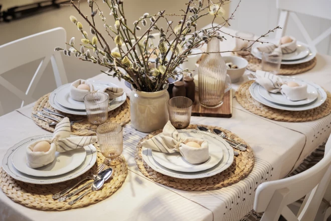 Начните сервировку стола с однотонной или нейтральной скатерти - это облегчит создание гармоничного образа. Для контраста сверху можно добавить более яркую или фактурную дорожку. Дизайнеры интерьеров советуют сначала оценить, что уже есть дома: можно дать вторую жизнь старому текстилю, например, использовать ткань от штор или другие отрезы. Натуральные материалы, такие как лен и хлопок, идеально подойдут для скатертей и салфеток, создавая цельный образ. "Выбирая посуду, учитывайте блюда и напитки, которые планируете подать. Тарелки и бокалы часто являются самой затратной частью сервировки, поэтому вместо того, чтобы заменять весь комплект, лучше сосредоточиться на декоре и добавить лишь один эффектный элемент. Например, ярко-желтые пиалы станут свежим праздничным акцентом. Важно сохранять простую цветовую палитру - слишком много оттенков могут выглядеть хаотично, поэтому стоит ограничиться максимум четырьмя цветами. Сочетание ярких тонов с классической белой посудой создаст сбалансированный образ. Весенние оттенки - розовый, белый, желтый и зеленый - отлично будут выглядит на пасхальном столе. Можно даже сочетать темную и светлую посуду: простые узоры или однотонные варианты прекрасно дополняют друг друга", - советует дизайнер интерьеров.