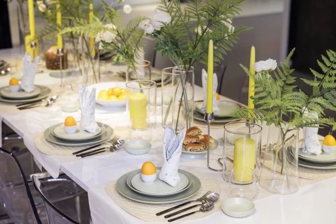 Руководитель отдела дизайна интерьеров IKEA Дариус Римкус советует сделать центральное украшение главным элементом пасхального стола, дополнив его природными и праздничными деталями. "Украсьте середину стола, разместив ряд стеклянных клошей или разноцветных пиал разного размера. Выбранную посуду можно наполнить мхом, или искусственными цветами, уже окрашенными яйцами или даже угощениями, например, шоколадными яйцами или фигурками зайцев. Вместо стеклянных клошей и пиал можно использовать желтую вазу, которая объединит цветовую гамму. Чтобы добавить композиции объема, по краям стола можно разместить горшки с нарциссами или графины с водой, создавая игру высоты и пространства".