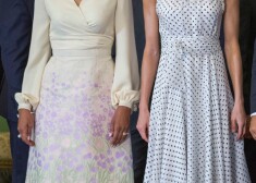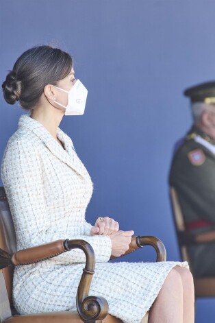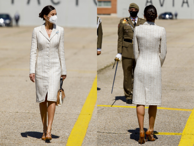 Вчера Летиция с официальным визитом прибыла на Военную базу. Для столь делового случая она выбрала соответствующий наряд — строгое платье-футляр на пуговица, выполненное из жаккардовой ткани молочного оттенка. Элегантный образ она дополнила лаконичными босоножками на каблуке и в тон к ним подобрала небольшую сумку. Как всегда идеально.