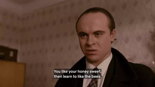 Поговорку бандита Круглого “Жизнь висит на нитке, а думает о прибытке” перевели как His life is hanging by a thread but he is thinking about the bread (“Его жизнь висит на волоске, а он думает о хлебе”). А выражение “Любишь медок — люби и холодок!” в англоязычной версии звучит так: You like your honey sweet, then learn to like the bees (“Любишь сладкий мед — полюби и пчел”).