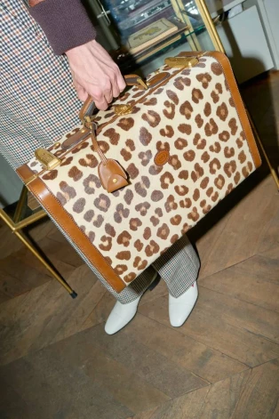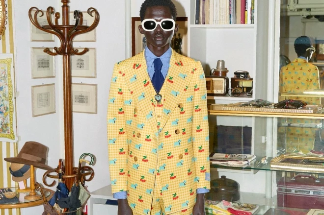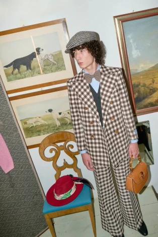 Есть в коллекции и аксессуары - фирменные лоферы на меху, версия легендарной сумки Gucci Bamboo с бамбуковой ручкой, впервые выпущенной еще в 1947 году, чемоданчик со звериным принтом, а также галстук-бабочка и веселые головные уборы, которые так любит носить Гарри.