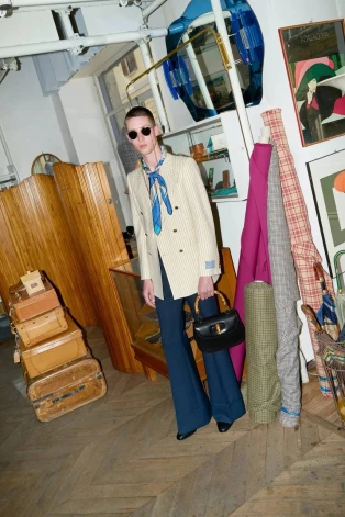 В ней гендерно-нейтральные костюмы, рубашки, трикотажные жилеты, расклешенные брюки, а также классические вещи в духе британского портновкого искусства - костюмы-тройки и пальто. Многие вещи украшены яркими принтами, в том числе с плюшевыми медведями, вишнями и овечками.
