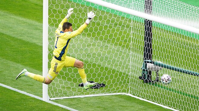 Удар Шика оказался настолько точным и неожиданным, что кипер Шотландии на всей скорости влетел в ворота и запутался в сетке.