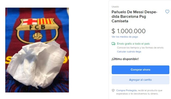 Но не простую, а именно ту (по крайней мере, так утверждает «предприниматель»), которой вытирал слезы Лео, говоря слова благодарности клубу, «приютившему» его на 20 лет. И повесил на нее «ценник» — 1 миллион аргентинских песо (10 тысяч долларов США).