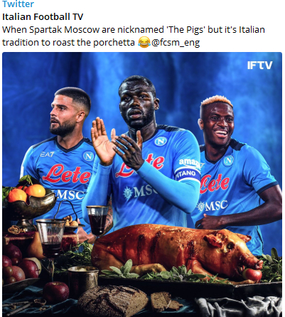 "Спартак" прозвали свиньями, но в Италии есть традиция жарить свинью", — говорилось в посте. Спустя некоторое время твит был удален.