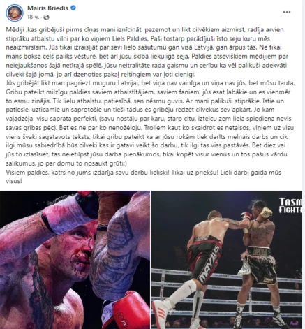 Боксер Майрис Бриедис опубликовал эмоциональный пост на своей странице в Facebook, в котором обвинил прессу.