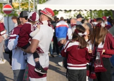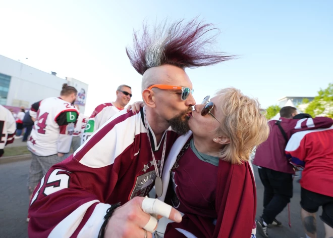 Днем латвийские хоккейные болельщики собрались у Памятника свободы, где спели гимн Латвии, а потом провели организованное шествие к Aрeне Рига, где проходит матч.