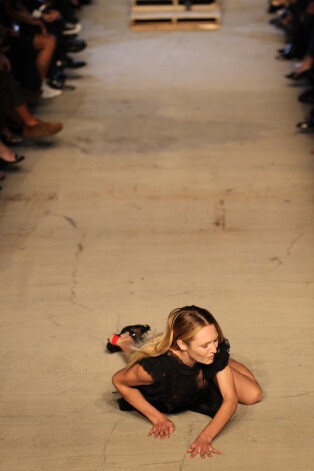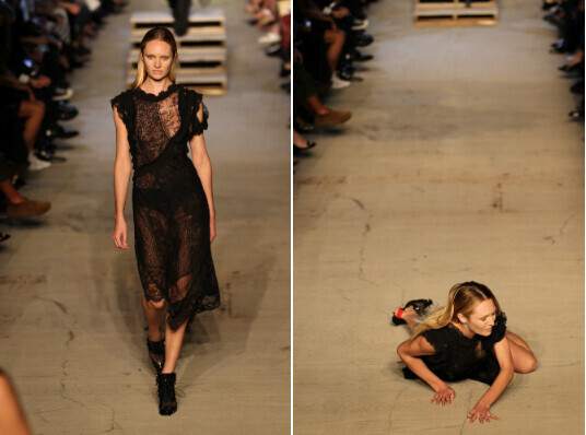 Модель Камилла Ви приземлилась на подиум в ходе показа Vivienne Westwood. В отличие от Наоми Кэмпбелл, которую в свое время подвели туфли, с Камиллой злую шутку сыграл реквизит — золотая лейка, буквально «перевесившая» модель в одну сторону.
