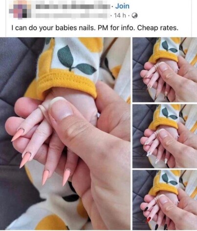 По информации издания, героиня материала (ее имя не раскрывается) опубликовала в соцсетях несколько рекламных фотографий, на которых запечатлены руки младенца с длинным ногтями с острой формой. «Я могу привести в порядок руки и вашего ребенка. Напишите мне в личные сообщения для более подробной информации. Низкие цены», — подписала она пост.