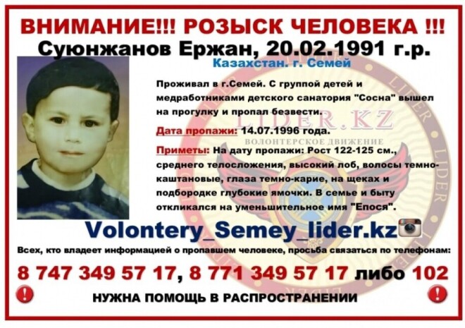 Вот уже 25 лет родственники Ержана Суюнжанова ищут мальчика по всему Казахстану. Когда малыш пропал в санатории, ему было пять лет. Мальчик вышел в лес на прогулку вместе с другими детьми, но погнался за бабочками и пропал. Работники санатория искали Ержана своими силами три дня, а затем, не найдя, признались родителям, которые сообщили об этом в полицию. Но драгоценное время было потеряно.