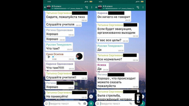 В Сети опубликовали переписку учителя и учеников 8 «Б» класса. «Закройте дверь изнутри, хоть на швабру, хоть на что-нибудь, держитесь все вместе», — писала Татьяна Сергеевна своим подопечным, стараясь прежде всего максимально успокоить их. «Как не паниковать, если в школе стреляют!» — можно увидеть в сообщениях. «Дверь дергают... Кто-то дверь дергает!» — писали испуганные подростки.